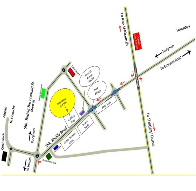 Our Contacts Map for EMA Roads Contracting L.L.C P.O.Box 13407 - Ajman - UAE Telephone: +971 6 7486 222 Fax: +971 6 7486 266 Email: info@emaroads.com
